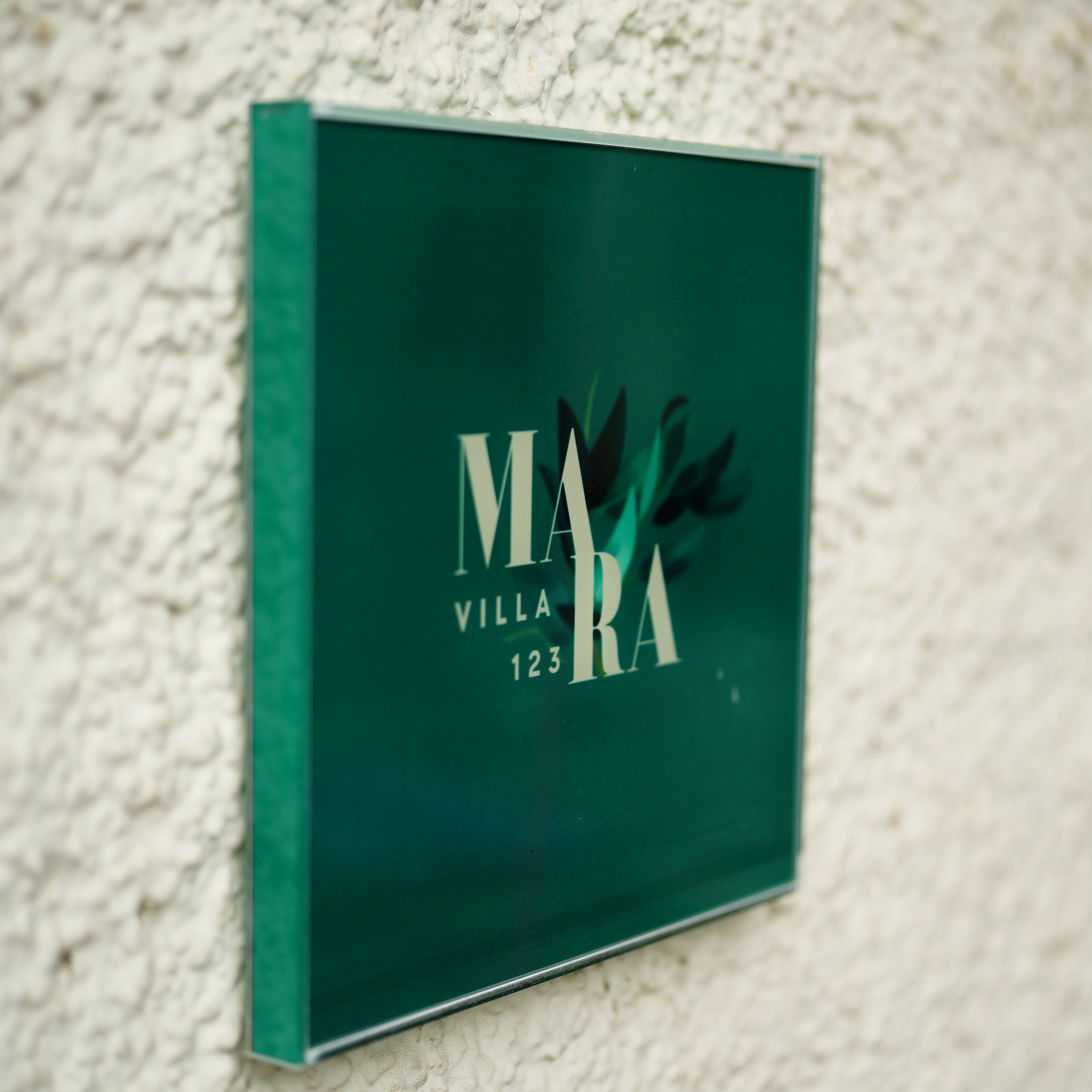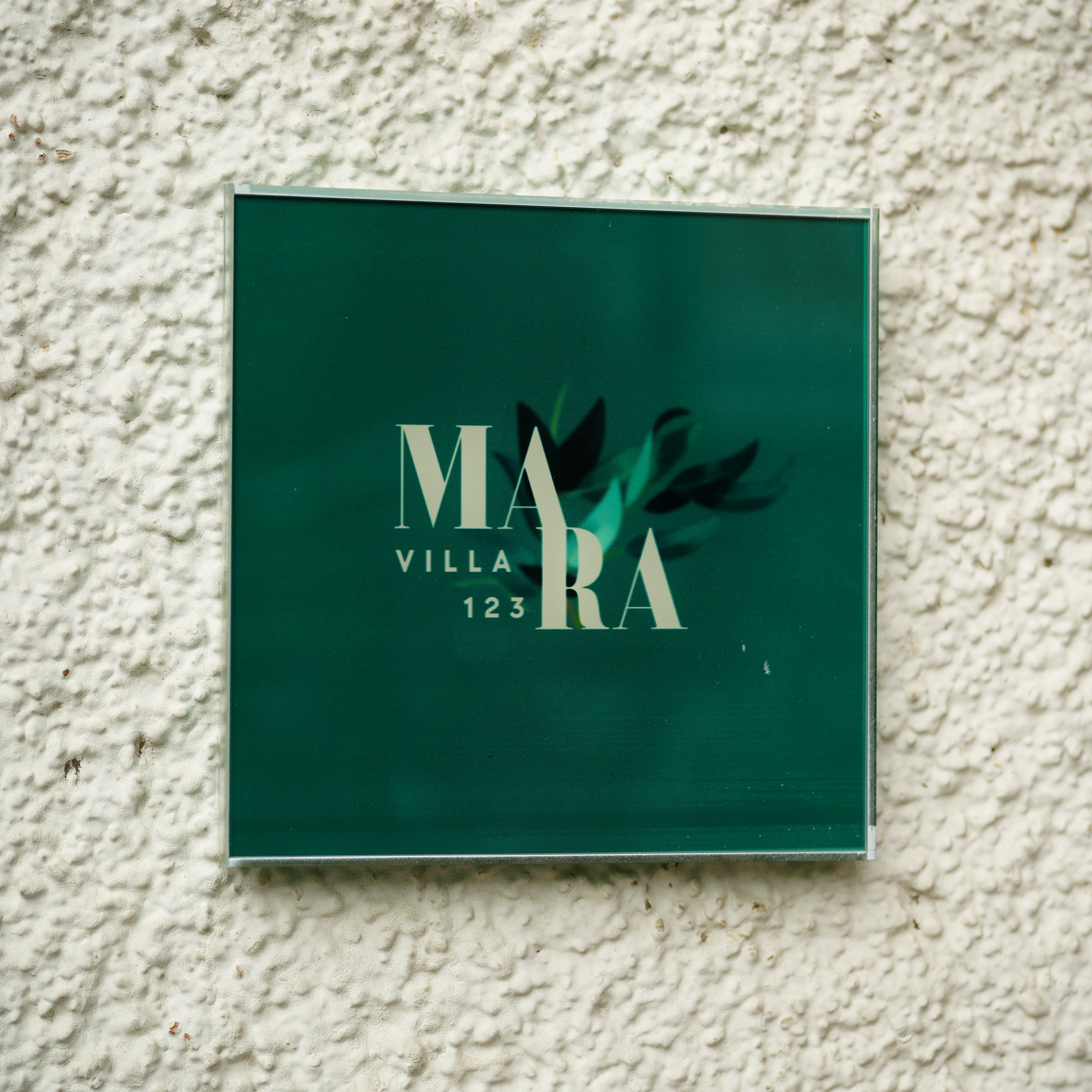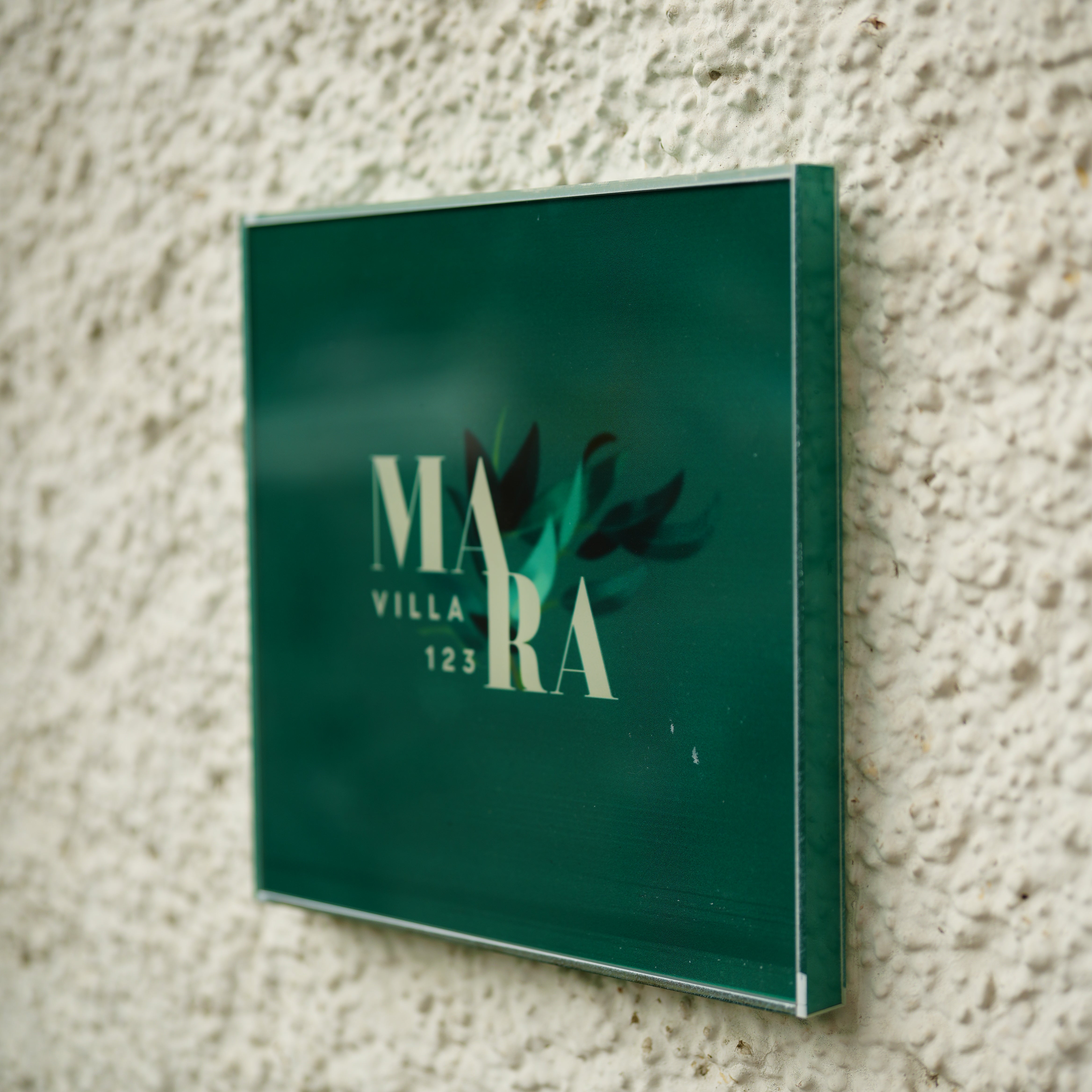 xThis Custom Acrylic Villa Name Board features a rich green background with a modern serif font and soft botanical leaf design, UV printed for vibrant and long-lasting finish. Made from high-quality acrylic, it brings a clean, sophisticated look to your villa, homestay, or gated home entrance.