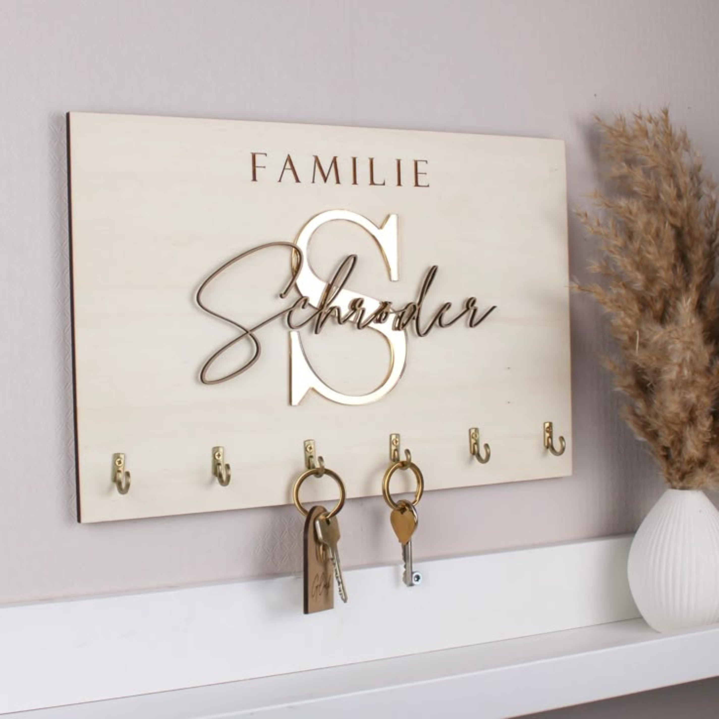 xBring elegance to your entryway with this customized wooden key holder featuring a family name and monogram in gold acrylic. Crafted from premium rubberwood, it combines style with function — a perfect décor piece for your home or as a thoughtful gift.