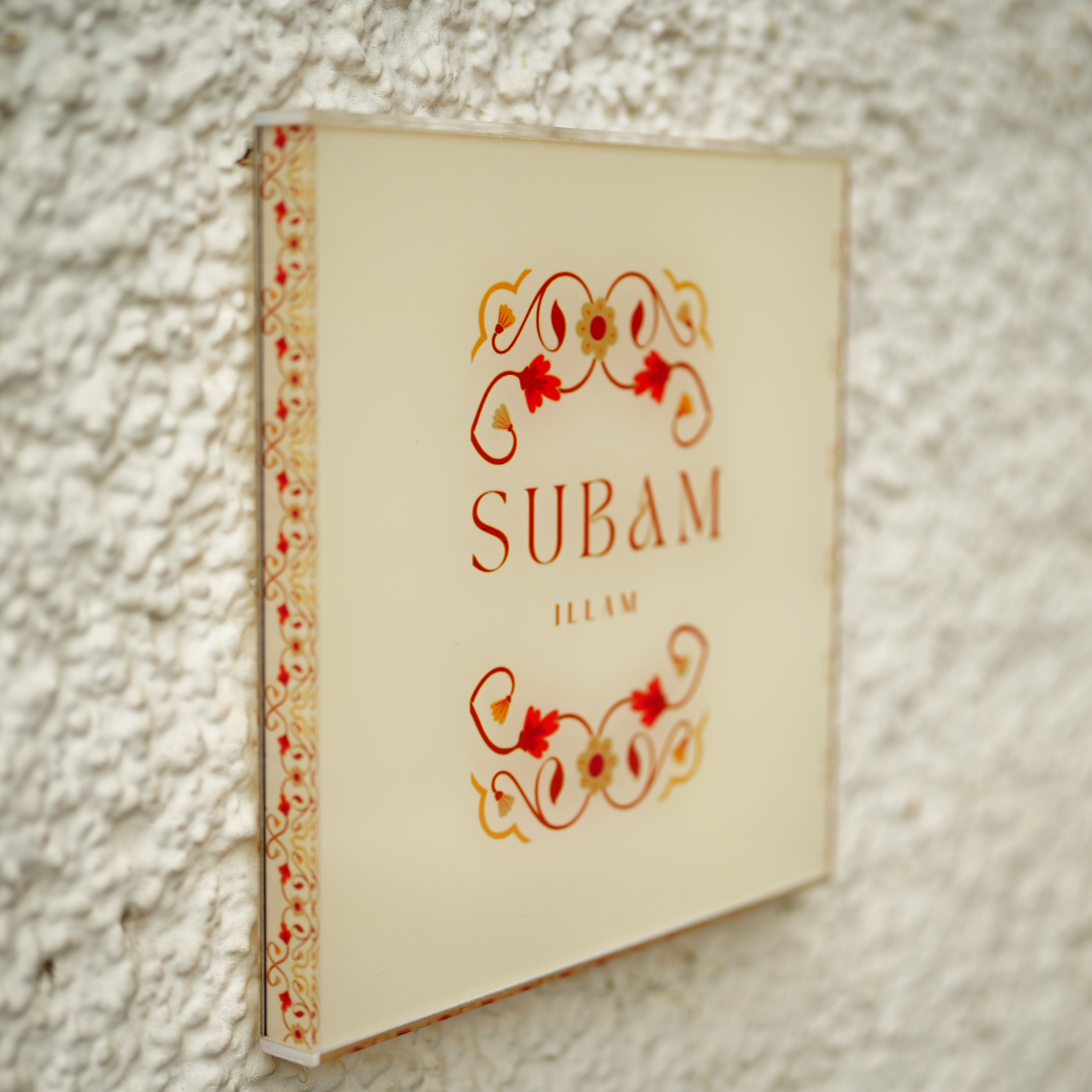 xCelebrate your roots with this Traditional Acrylic Name Board, featuring warm cream tones and rich red-yellow floral art. Printed with precision using UV technology, this board combines classical charm with modern durability. Ideal for homes that embrace cultural aesthetics while keeping it minimal and refined.